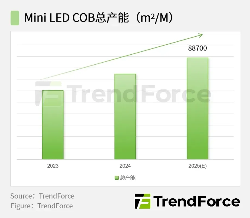 LED企业和面板厂的动作使Mini COB直显的产能爆发式增长。TrendForce集邦咨询研究显示,Mini COB直显在2022年的产能仅有21400㎡/月,2024年底则达到了60300 ㎡/月的水平,预计2025年底将达到88700㎡/月——短短3年间,产能实现了4倍多的增长。