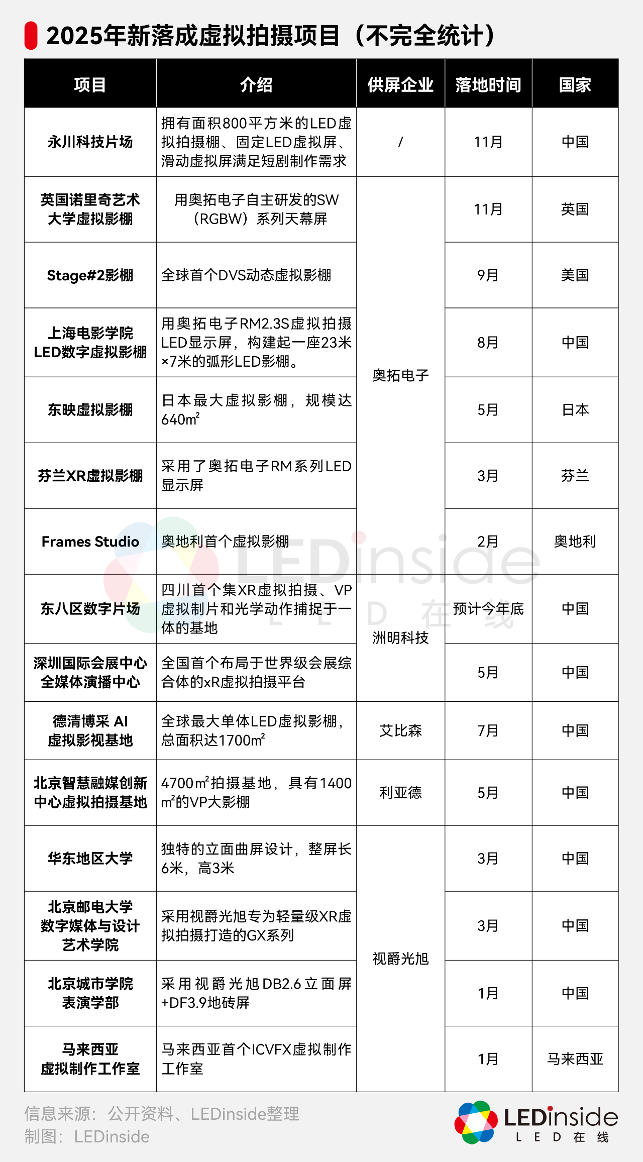 2025年LED虚拟拍摄项目建设仍在继续,LEDinside根据公开资料不完全统计,今年,奥拓电子、艾比森、利亚德、洲明科技、视爵光旭等国内企业继续推动最新LED虚拟拍摄影棚项目落地。