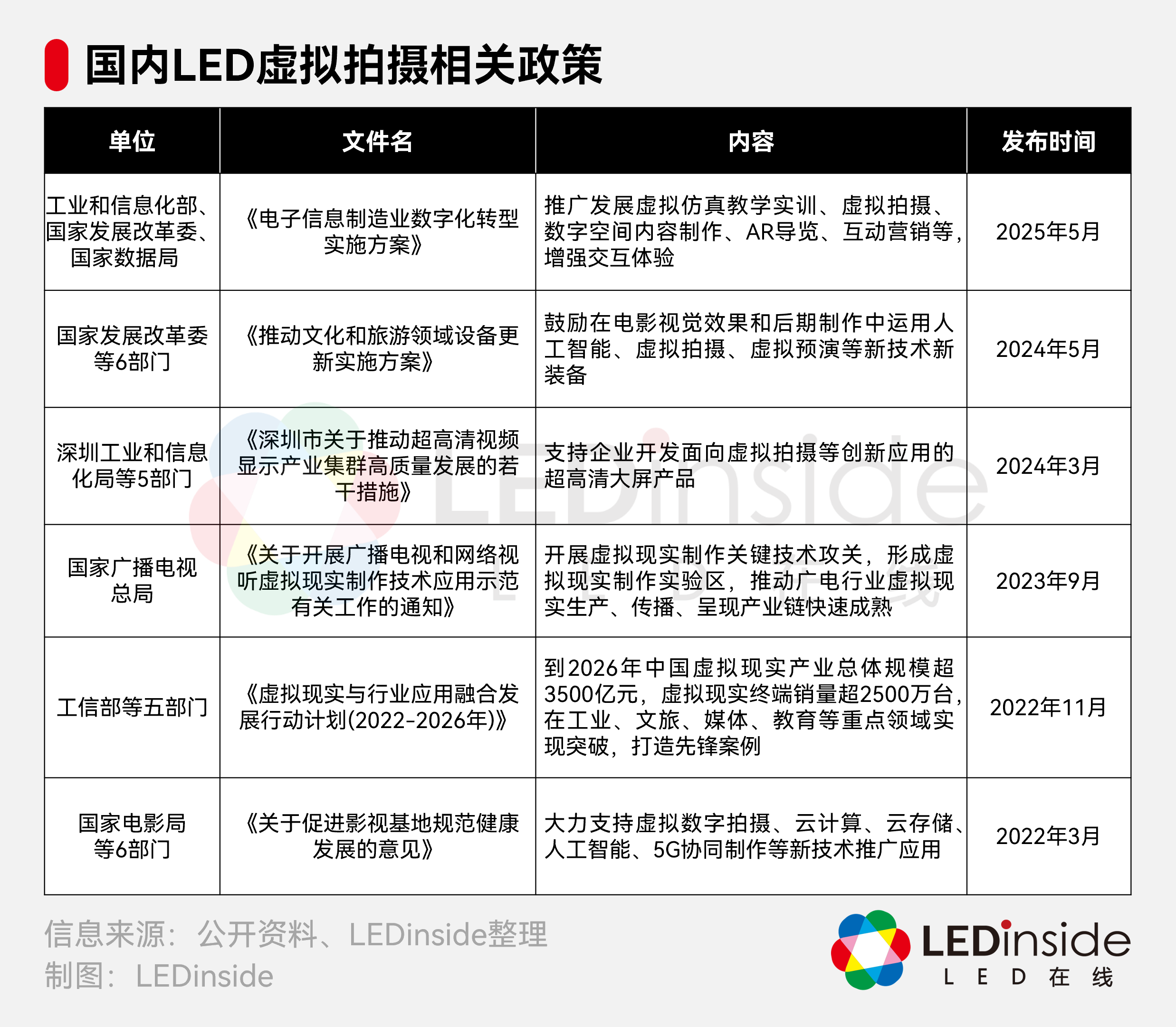 影视行业更为发达的北美地区,对LED虚拟拍摄技术已形成更为成熟与规范的技术体系,反映出北美市场对LED虚拟拍摄技术价值具有更深的认知程度,也一定程度意味着该市场未来将是较稳定的需求来源地。 相比之下,以中国为核心的亚洲市场则呈现出一种“政策驱动+新兴内容井喷”的双轮驱动的发展态势。 政策红利一直是国内LED虚拟拍摄技术发展不可忽视的推手。早在2022年开始,政府每年都有相关政策发布,鼓励LED虚拟拍摄产业的发展。2025年,工信部等三部门则联合印发《电子信息制造业数字化转型实施方案》明确鼓励推广虚拟拍摄、沉浸式视频等技术发展。