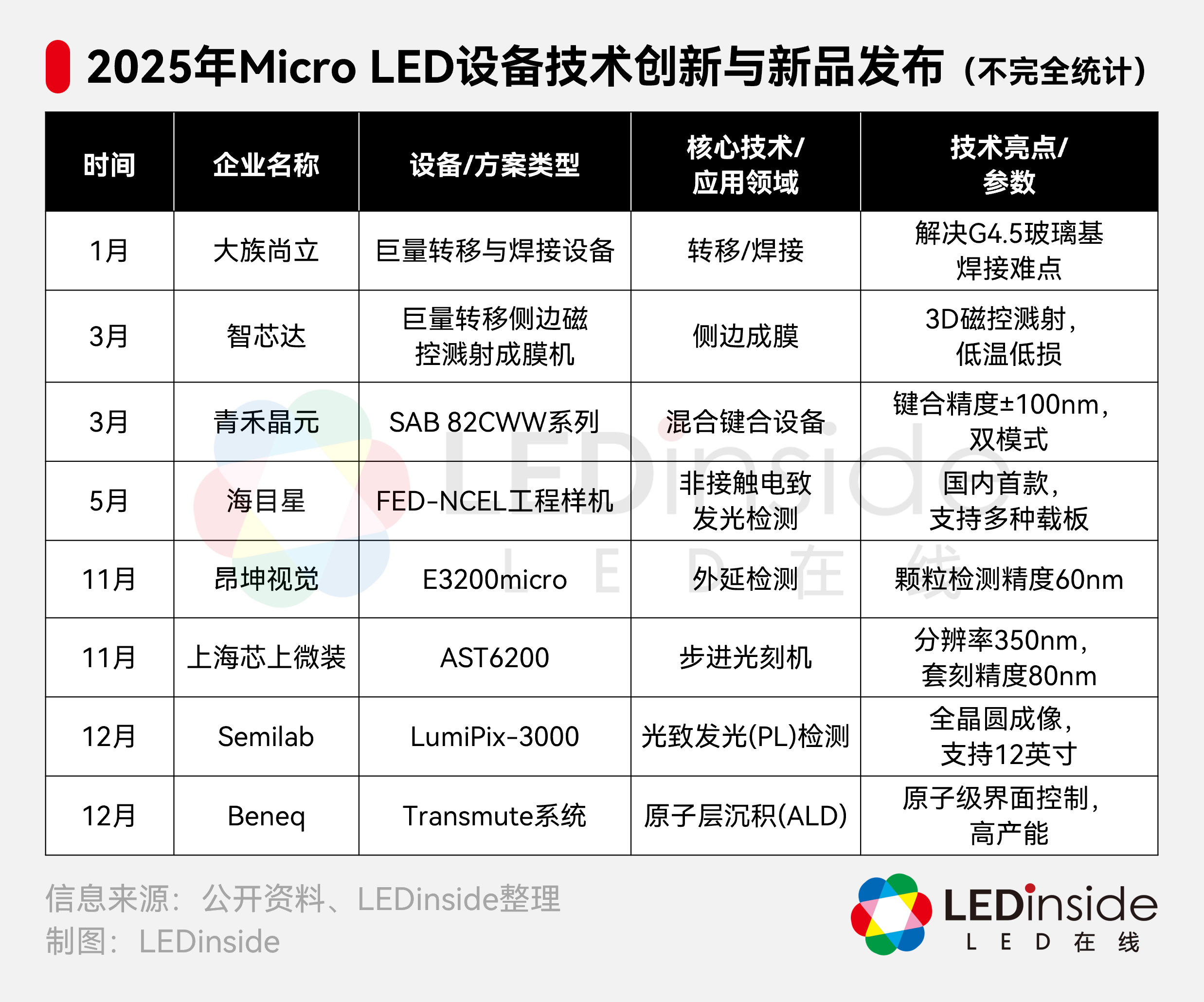 Micro LED大规模产业化的核心痛点在于良率管理、巨量转移效率以及检测修复成本。针对这些痛点,国内外设备厂商在2025年推出了多项针对性的创新产品,技术指标持续刷新。
