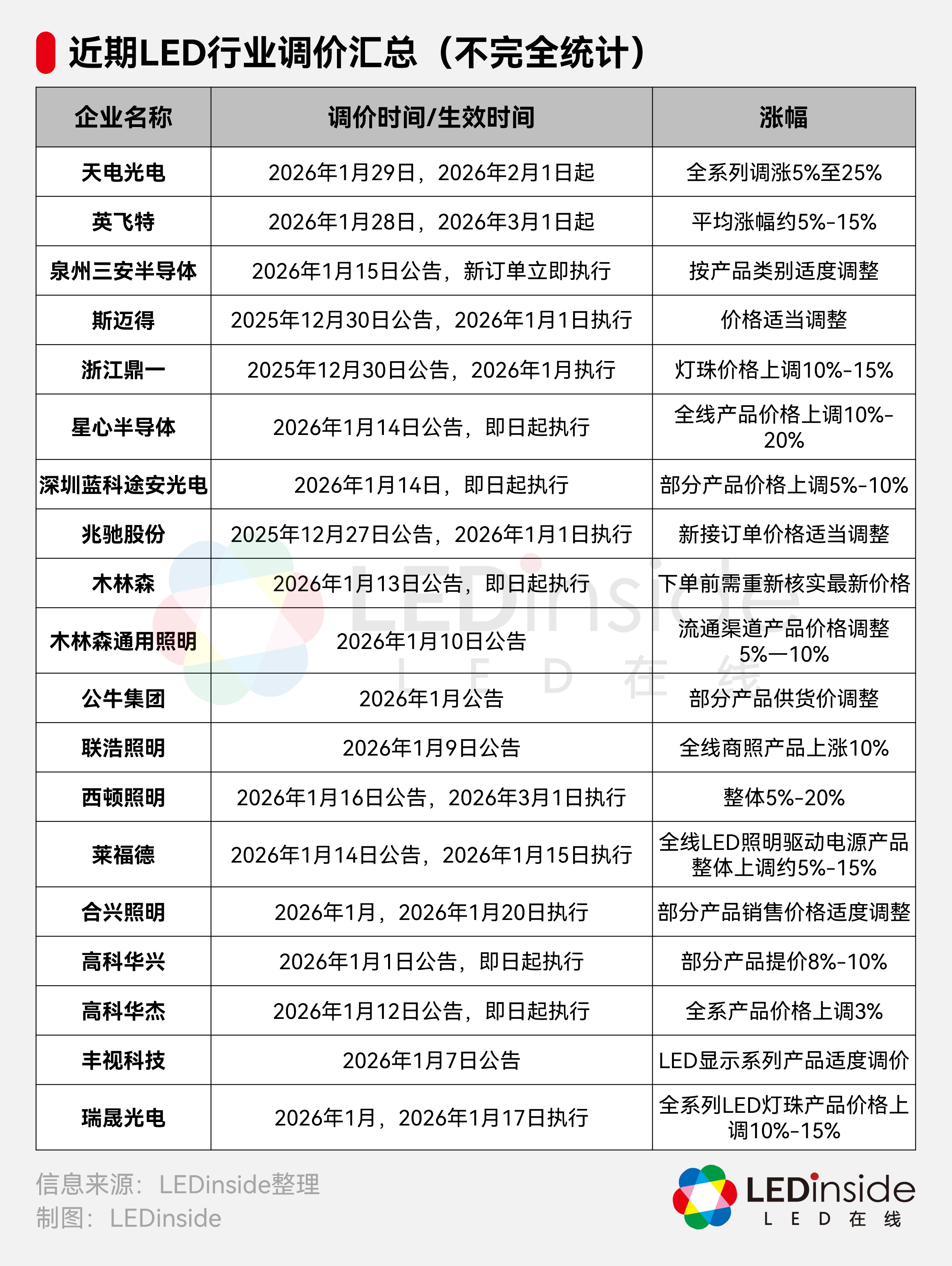 1月28日,LED驱动电源企业英飞特表示,经公司审慎评估,对部分受成本压力显著影响的产品系列进行价格调整。自2026年3月1日起,对受成本压力影响最为集中的产品线进行调整,本次价格将进行适度上调,平均涨幅约为5%-15%。