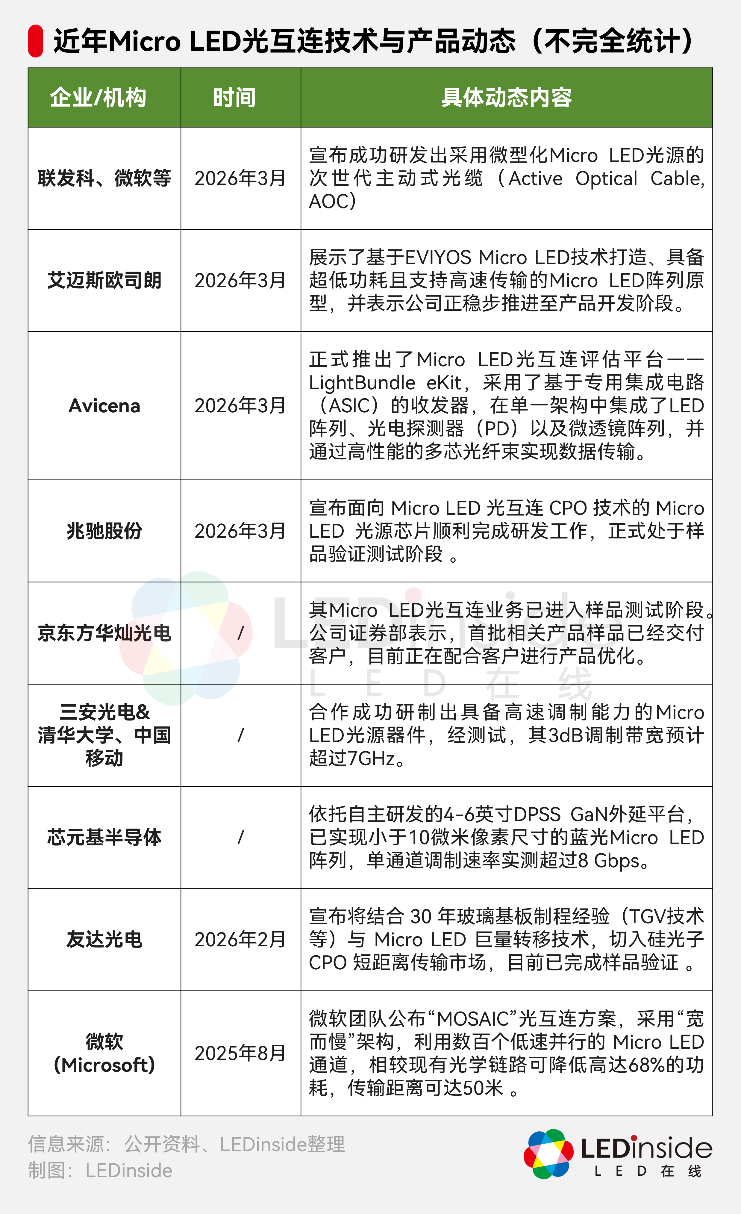 在商业化时间表方面,目前该技术方案大多处于前期设计与可靠性测试环节。预计在极其顺利的情况下,有望在两至三年后(即2026年至2027年期间)实现机柜内光通信应用的小规模商业导入,届时Micro LED光互连技术将正式迎来发展元年。
