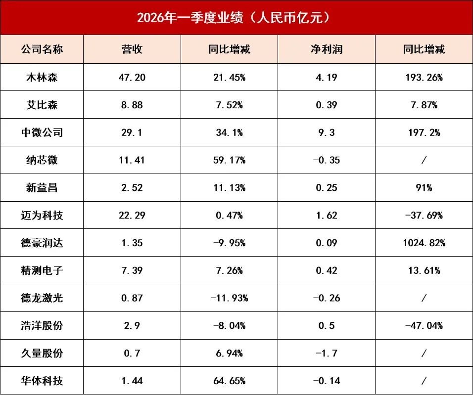 近日,木林森、艾比森、中微公司、纳芯微、新益昌、迈为科技、德豪润达、精测电子、德龙激光、浩洋股份、久量股份、华体科技等12家企业相继发布最新业绩。