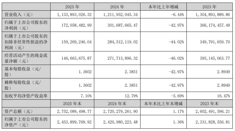 浩洋股份2025年营业收入为11.34亿元,同比下降6.4%;归母净利润为1.72亿元,同比下降42.97%。