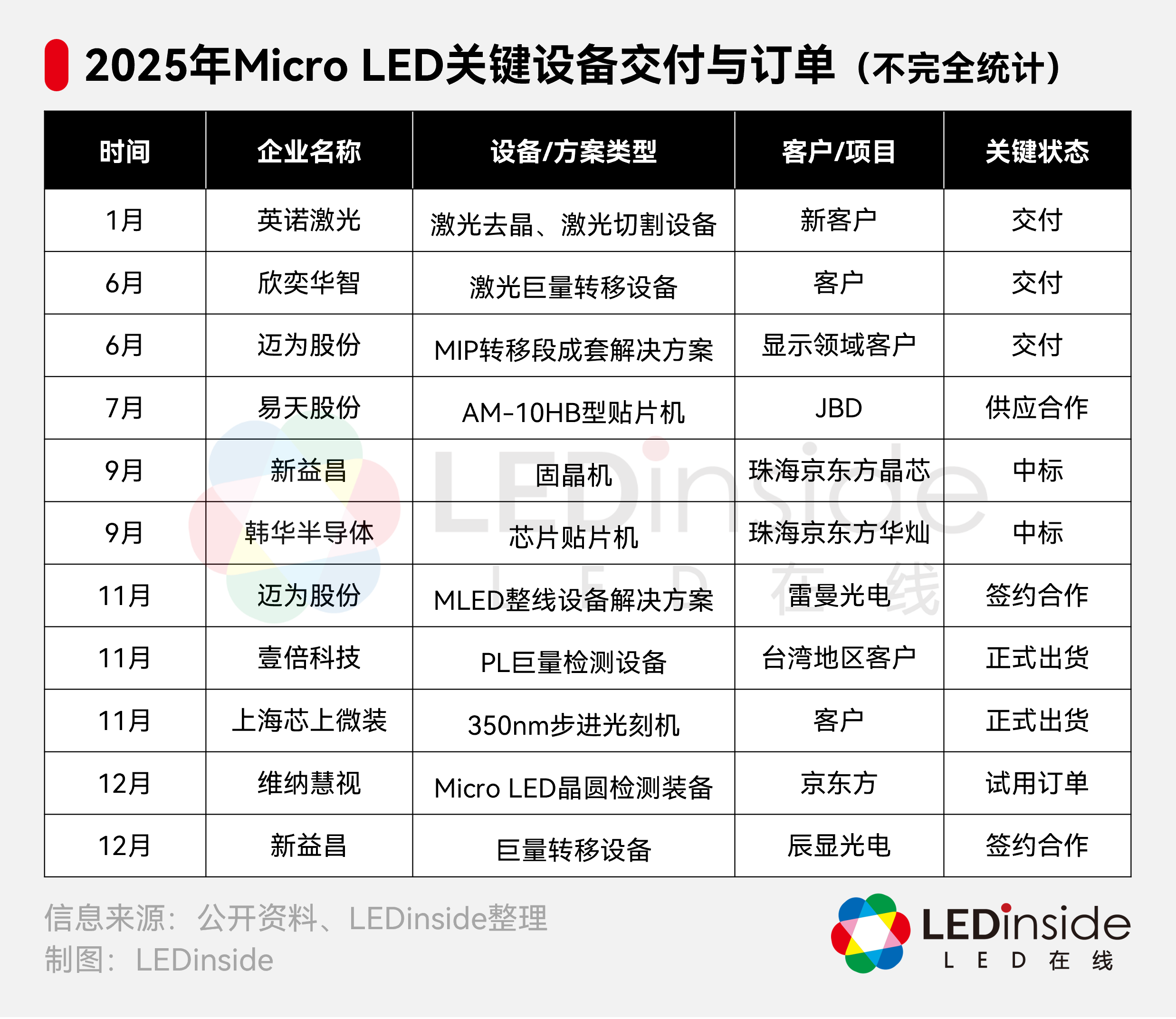 衡量设备行业成熟度最直观的指标是交付与订单。2025年,Micro LED设备领域最显著的变化在于设备的交付。不同于以往单机台的零星试用,这一年不仅出现了整线解决方案的签约与落地,关键制程设备也实现了向头部客户的批量出货。