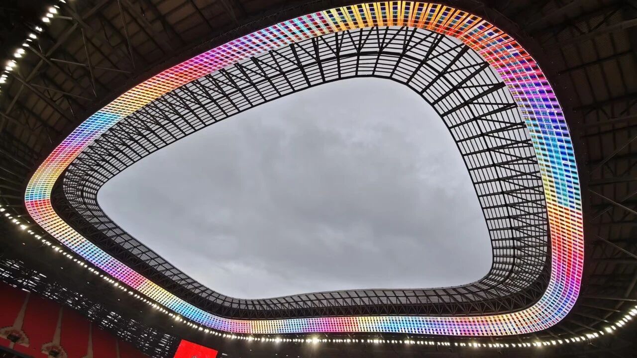 穆莱·阿卜杜拉王子体育场建筑结构复杂,顶部呈非标准圆形,存在多处凹凸弧线,对显示产品的适配性提出极高挑战。面对这一难题,艾比森团队通过创新的钢结构设计,将标准A1025模组精准嵌入异形空间,实现360°无死角环绕覆盖。整套显示系统如光环般贴合体育场穹顶轮廓,既保留了建筑原有的美学特征,又赋予其前所未有的数字生命力。