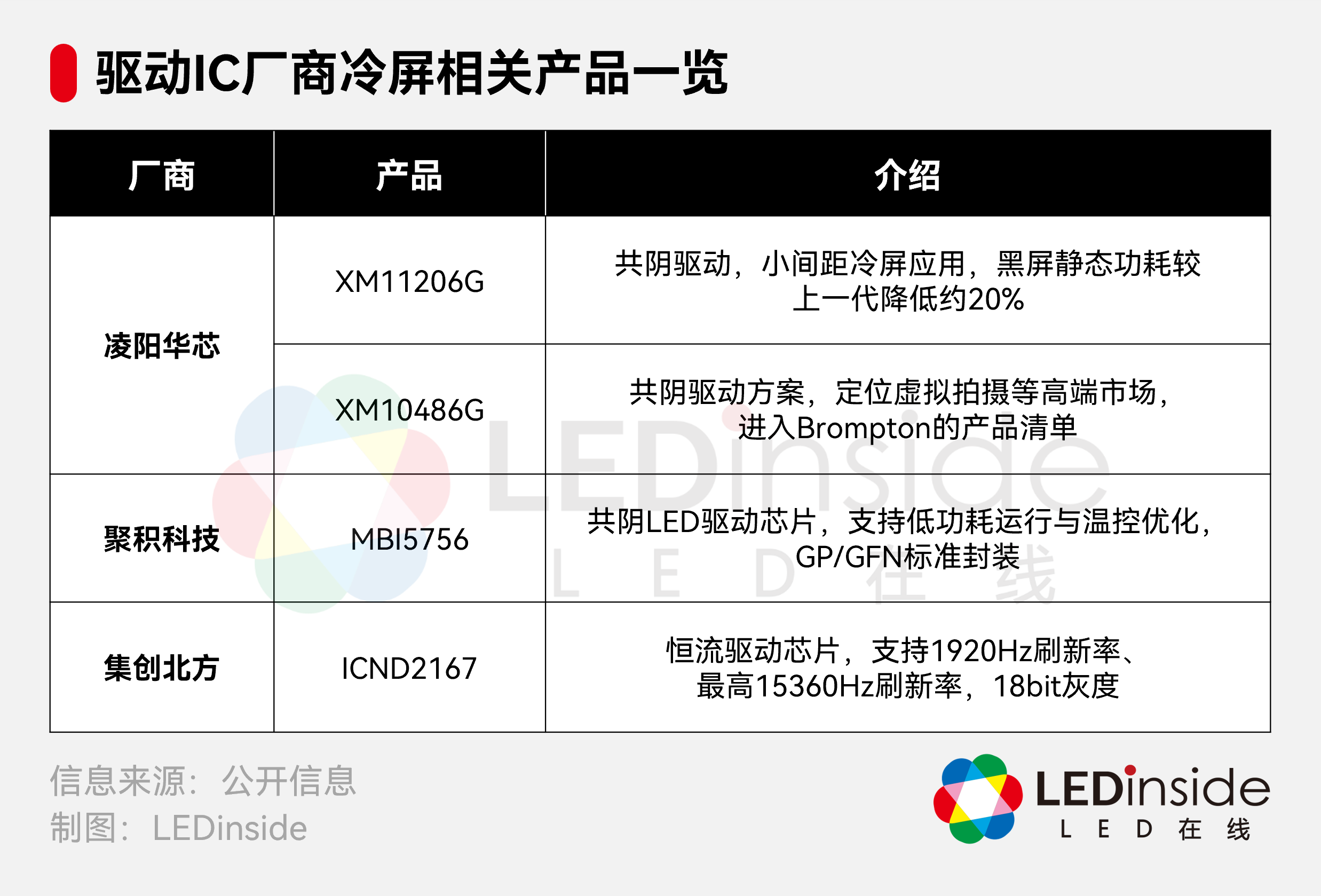 在冷屏技术体系中,节能与性能兼顾的驱动IC通常采用高集成度设计,并结合共阴驱动架构,以降低系统功耗和发热。在这一技术方向上,主流驱动IC厂商均已展开布局,部分例子如下: