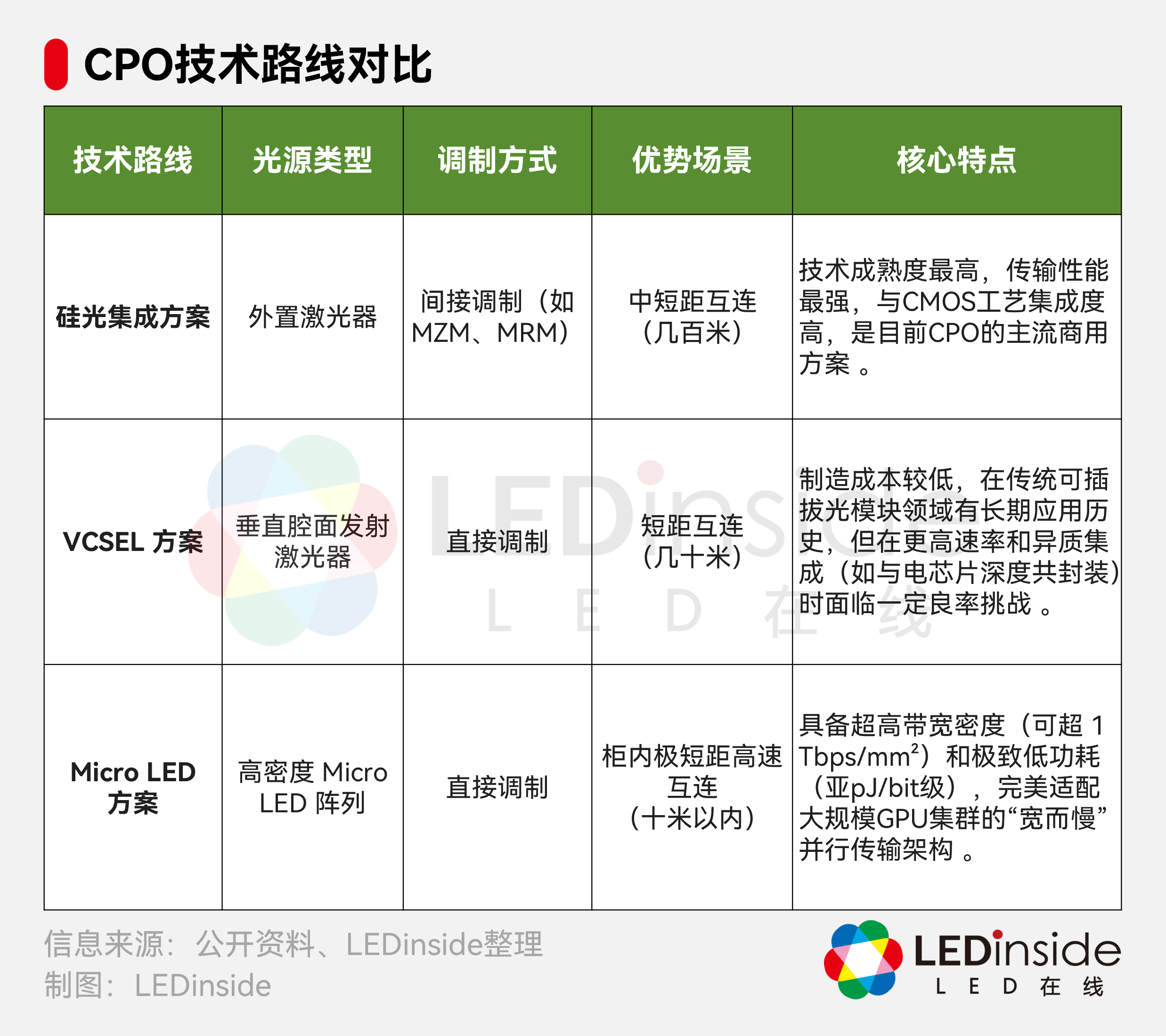 而在CPO光源技术路线中,除了主流的硅光集成方案和VCSEL(垂直腔面发射激光器)方案外,Micro LED作为一种新兴的光互连光源正异军突起。相比于其他方案,Micro LED CPO在满足智算中心机柜内超短距、高密度互连需求方面,展现出了极其独特的物理与架构优势。