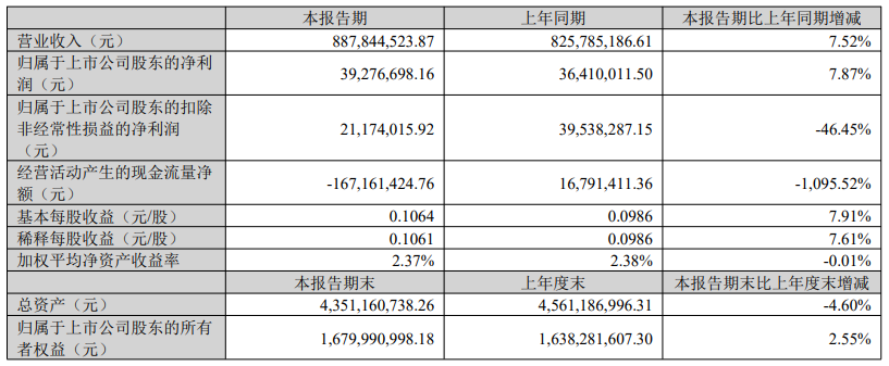 今年一季度,公司实习营业收入7.39亿元,同比增长7.26%,归属于上市公司股东的净利润4271万元,同比增长13.61%。